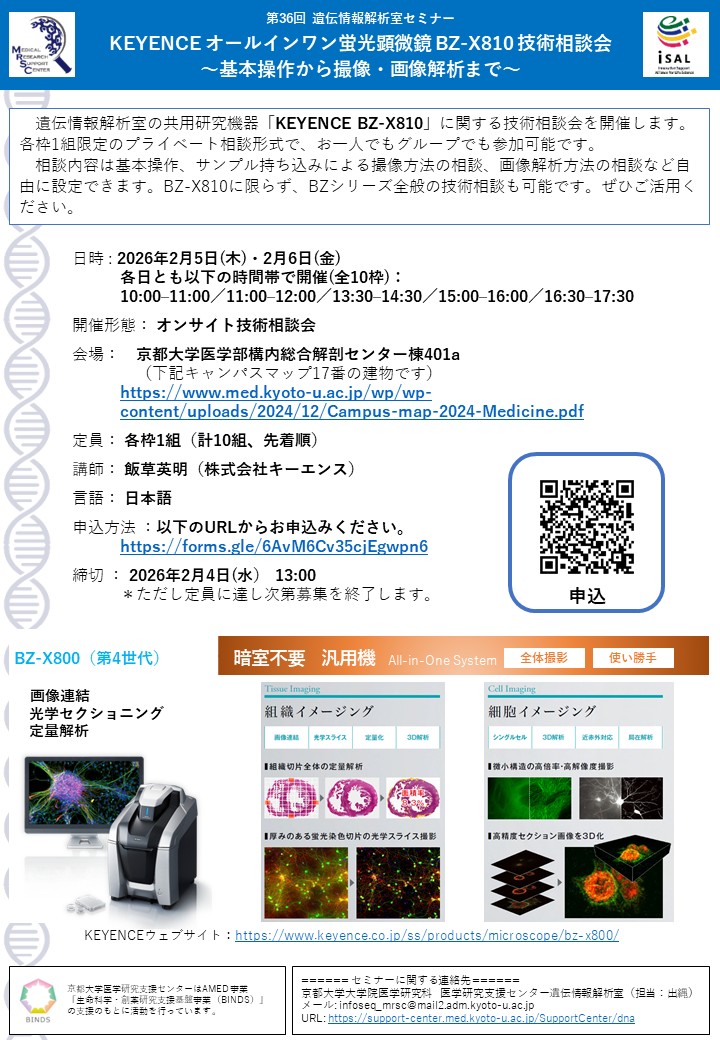 備考:本セミナーは情報提供を目的としたものであり、紹介する機器は遺伝情報解析室の共用機器ではありません。