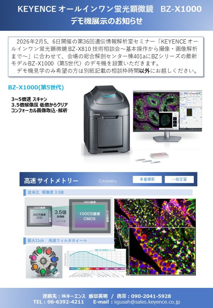 【遺伝情報解析室】第36回遺伝情報解析室セミナー「KEYENCE オールインワン蛍光顕微鏡 BZ-X810 技術相談会 〜基本操作から撮像・画像解析まで〜」を開催します