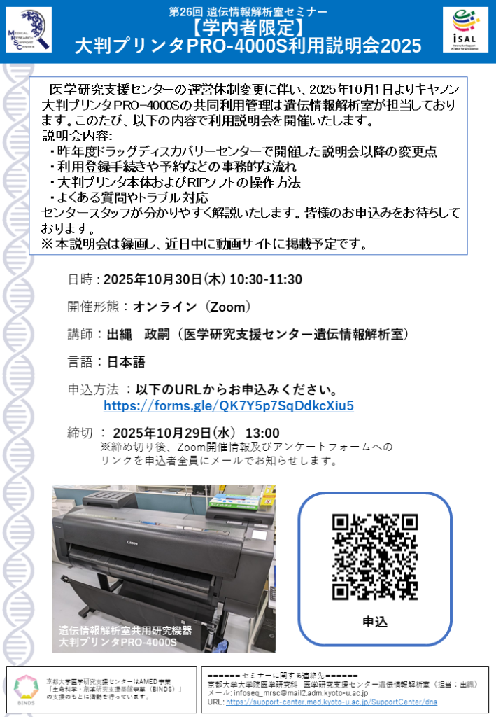 【遺伝情報解析室】第26回遺伝情報解析室セミナー「【学内者限定】大判プリンタPRO-4000S利用説明会2025」を開催します | 京都大学大学院医学研究科医学研究支援センター